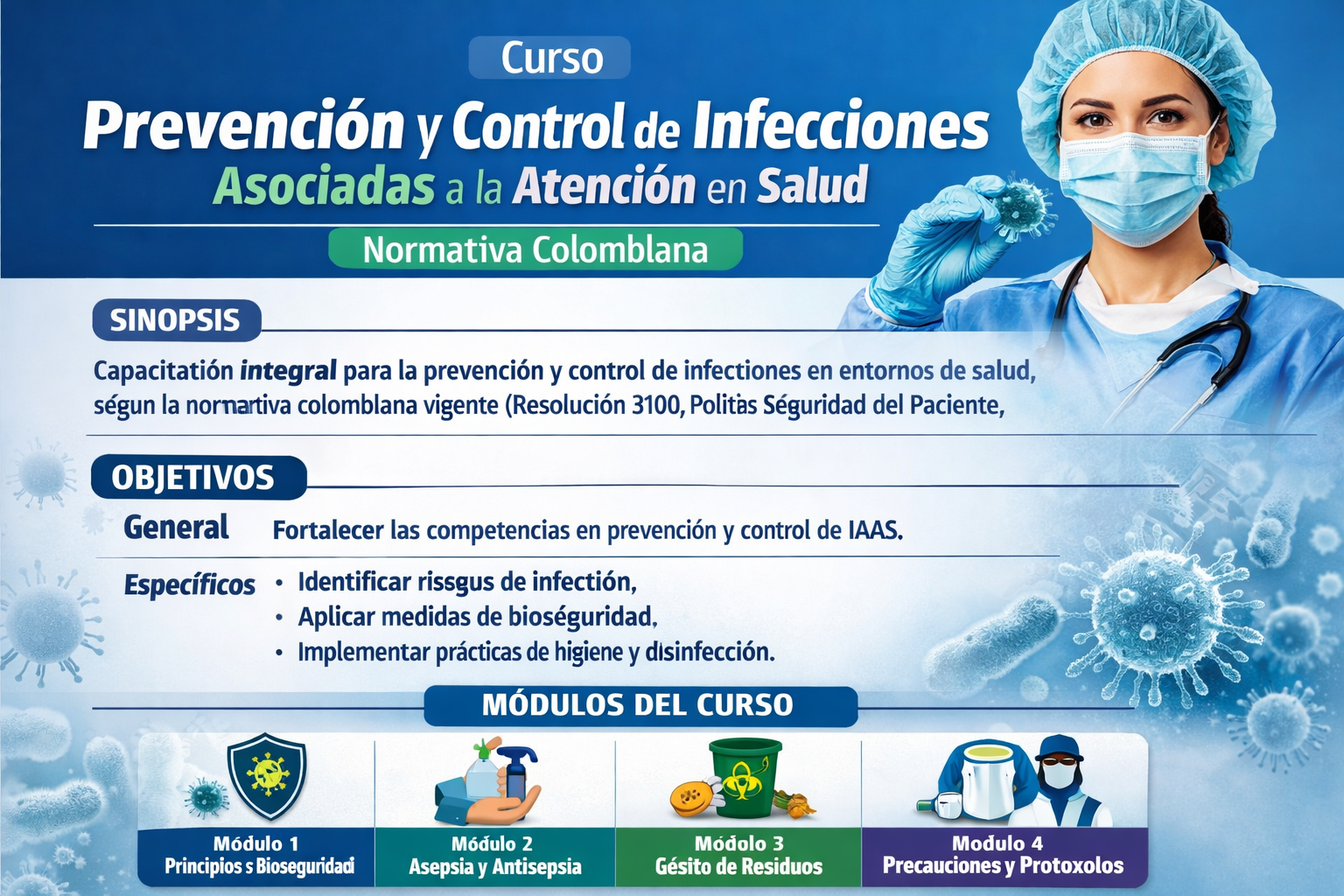 Objetivos específicos • Reconocer los conceptos básicos y la importancia de las IAAS en la seguridad del paciente. • Identificar el marco normativo colombiano relacionado con la prevención y control de infecciones. • Aplicar adecuadamente las medidas de bioseguridad y las precauciones estándar y basadas en la transmisión. • Implementar prácticas seguras de limpieza, desinfección y esterilización. • Fortalecer la vigilancia epidemiológica y la notificación de eventos asociados a infecciones. • Promover una cultura de seguridad y calidad en los servicios de salud.
